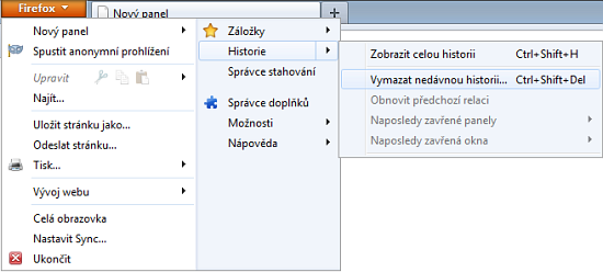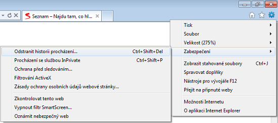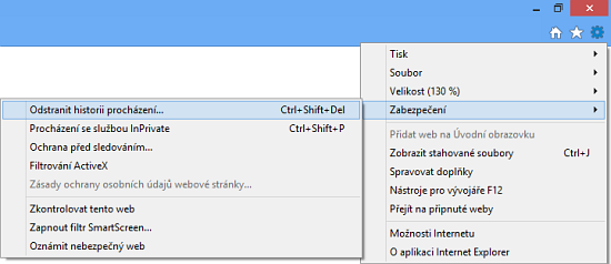"Nástroje", "Zabezpečení" a následně zvolte "Odstranit historii procházení"